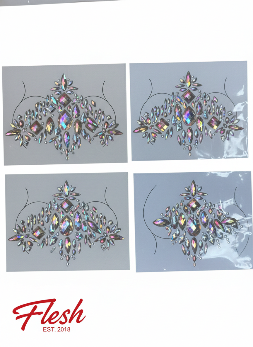 Elevate your look from ordinary to otherworldly. This Flesh Est. 2018 collection features four intricately designed, adhesive gem clusters that catch the light from every angle. Whether you're hitting the main stage at a festival, heading to a rave, or looking for that perfect editorial glow, these iridescent jewels are your ultimate accessory.