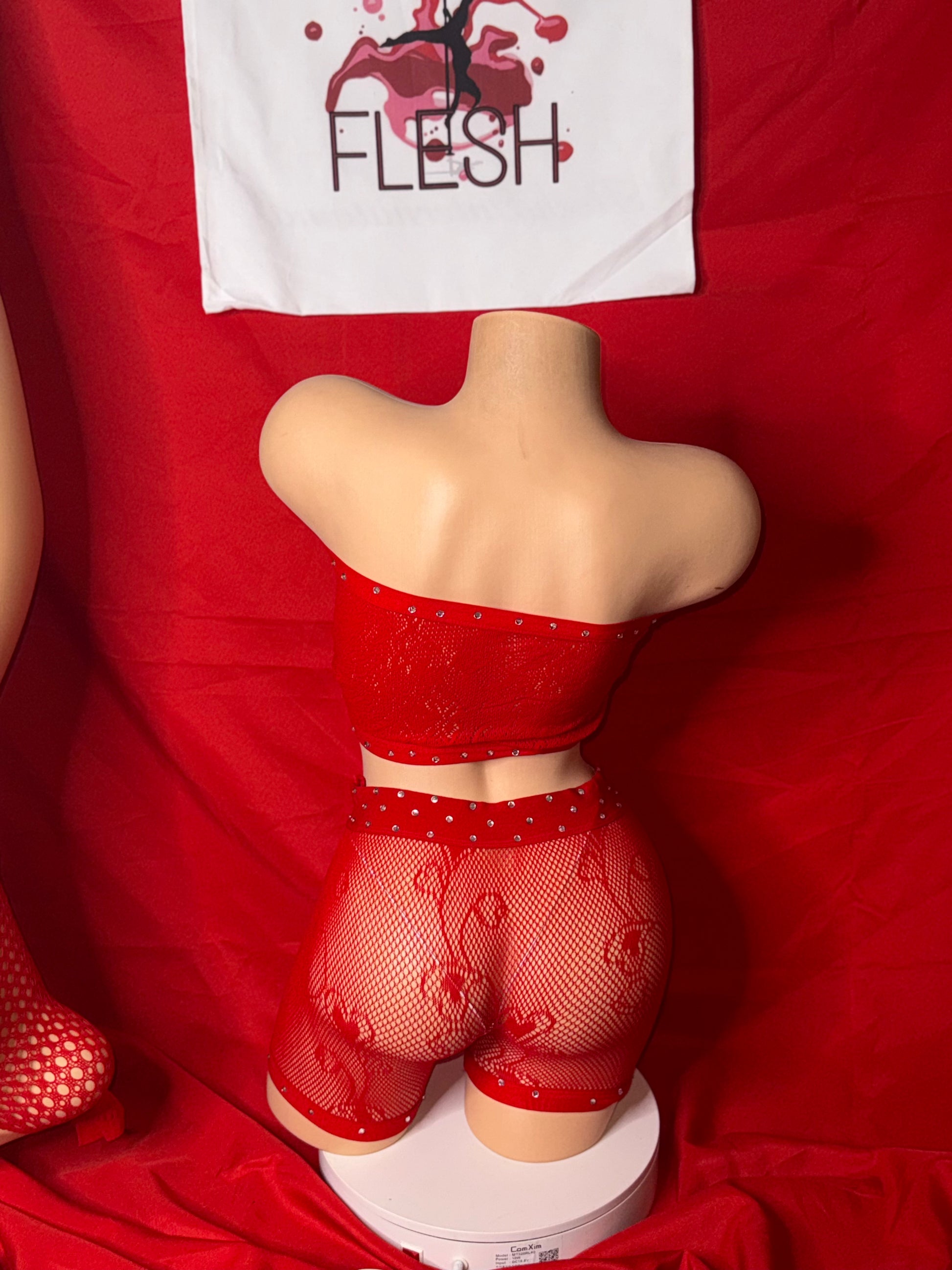 Turn heads and stop scrolls. This two-piece set features a daring, ultra-stretchy lime fishnet overlay that transitions into a vibrant sunset pink. Adorned with hand-placed rhinestones, this set catches every light—perfect for the stage, the club, or your next viral photoshoot.